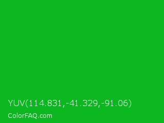 YUV 114.831,-41.329,-91.06 Color is a normal green color and the nearest color is Vivid Malachite #00cc33. Hex code #0bb81f and RGB value is rgb(11,184,31). In RGB color space, this color is composed of 4% red, 72% green, 12% blue, In CMYK color space, this color is composed of 94% cyan, 0% magenta, 83% yellow , 28% black , In HSL color space, this color has a hue angle of 127° , 89% saturation and 38% lightness.