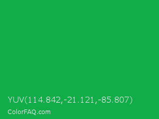 YUV 114.842,-21.121,-85.807 Color is a normal green color and the nearest color is Green Pantone #00ad43. Hex code #11ad48 and RGB value is rgb(17,173,72). In RGB color space, this color is composed of 7% red, 68% green, 28% blue, In CMYK color space, this color is composed of 90% cyan, 0% magenta, 58% yellow , 32% black , In HSL color space, this color has a hue angle of 141° , 82% saturation and 37% lightness.