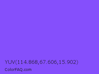YUV 114.868,67.606,15.902 Color is a light indigo color and the nearest color is Navy Purple #9457eb. Hex code #854ffc and RGB value is rgb(133,79,252). In RGB color space, this color is composed of 52% red, 31% green, 99% blue, In CMYK color space, this color is composed of 47% cyan, 69% magenta, 0% yellow , 1% black , In HSL color space, this color has a hue angle of 259° , 97% saturation and 65% lightness.