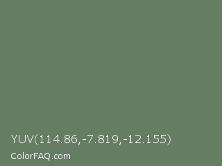 YUV 114.86,-7.819,-12.155 Color is a normal green color and the nearest color is Glade Green #61845f. Hex code #657d63 and RGB value is rgb(101,125,99). In RGB color space, this color is composed of 40% red, 49% green, 39% blue, In CMYK color space, this color is composed of 19% cyan, 0% magenta, 21% yellow , 51% black , In HSL color space, this color has a hue angle of 115° , 12% saturation and 44% lightness.