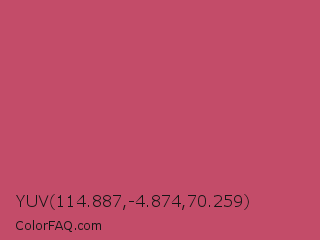 YUV 114.887,-4.874,70.259 Color is a normal red color and the nearest color is Popstar #be4f62. Hex code #c34c69 and RGB value is rgb(195,76,105). In RGB color space, this color is composed of 76% red, 30% green, 41% blue, In CMYK color space, this color is composed of 0% cyan, 61% magenta, 46% yellow , 24% black , In HSL color space, this color has a hue angle of 345° , 50% saturation and 53% lightness.