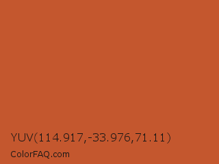 YUV 114.917,-33.976,71.11 Color is a normal orange color and the nearest color is Tuscany #bd5e2e. Hex code #c4572e and RGB value is rgb(196,87,46). In RGB color space, this color is composed of 77% red, 34% green, 18% blue, In CMYK color space, this color is composed of 0% cyan, 56% magenta, 77% yellow , 23% black , In HSL color space, this color has a hue angle of 16° , 62% saturation and 47% lightness.