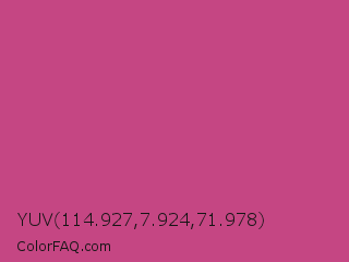 YUV 114.927,7.924,71.978 Color is a normal rose color and the nearest color is Smitten #c84186. Hex code #c54683 and RGB value is rgb(197,70,131). In RGB color space, this color is composed of 77% red, 27% green, 51% blue, In CMYK color space, this color is composed of 0% cyan, 64% magenta, 34% yellow , 23% black , In HSL color space, this color has a hue angle of 331° , 52% saturation and 52% lightness.