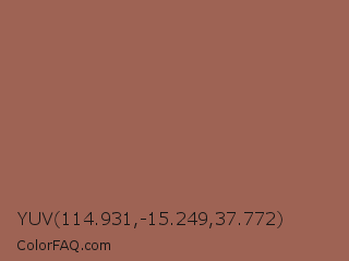 YUV 114.931,-15.249,37.772 Color is a normal red color and the nearest color is Redwood #a45a52. Hex code #9e6354 and RGB value is rgb(158,99,84). In RGB color space, this color is composed of 62% red, 39% green, 33% blue, In CMYK color space, this color is composed of 0% cyan, 37% magenta, 47% yellow , 38% black , In HSL color space, this color has a hue angle of 12° , 31% saturation and 47% lightness.