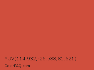 YUV 114.932,-26.588,81.621 Color is a normal red color and the nearest color is Valencia #d84437. Hex code #d04e3d and RGB value is rgb(208,78,61). In RGB color space, this color is composed of 82% red, 31% green, 24% blue, In CMYK color space, this color is composed of 0% cyan, 63% magenta, 71% yellow , 18% black , In HSL color space, this color has a hue angle of 7° , 61% saturation and 53% lightness.