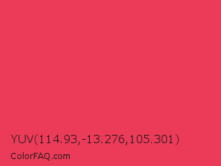 YUV 114.93,-13.276,105.301 Color is a normal red color and the nearest color is Desire #ea3c53. Hex code #eb3b58 and RGB value is rgb(235,59,88). In RGB color space, this color is composed of 92% red, 23% green, 35% blue, In CMYK color space, this color is composed of 0% cyan, 75% magenta, 63% yellow , 8% black , In HSL color space, this color has a hue angle of 350° , 81% saturation and 58% lightness.