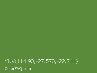 YUV 114.93,-27.573,-22.741 Color is a normal green color and the nearest color is Maximum Green #5e8c31. Hex code #598b3b and RGB value is rgb(89,139,59). In RGB color space, this color is composed of 35% red, 55% green, 23% blue, In CMYK color space, this color is composed of 36% cyan, 0% magenta, 58% yellow , 45% black , In HSL color space, this color has a hue angle of 98° , 40% saturation and 39% lightness.
