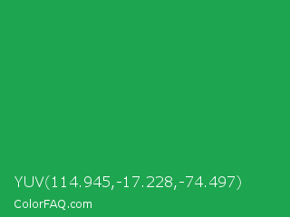 YUV 114.945,-17.228,-74.497 Color is a normal green color and the nearest color is Green Pigment #00a550. Hex code #1ea550 and RGB value is rgb(30,165,80). In RGB color space, this color is composed of 12% red, 65% green, 31% blue, In CMYK color space, this color is composed of 82% cyan, 0% magenta, 52% yellow , 35% black , In HSL color space, this color has a hue angle of 142° , 69% saturation and 38% lightness.