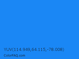 YUV 114.949,64.115,-78.008 Color is a normal blue color and the nearest color is Dodger Blue #1e90ff. Hex code #1a87f5 and RGB value is rgb(26,135,245). In RGB color space, this color is composed of 10% red, 53% green, 96% blue, In CMYK color space, this color is composed of 89% cyan, 45% magenta, 0% yellow , 4% black , In HSL color space, this color has a hue angle of 210° , 92% saturation and 53% lightness.