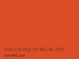 YUV 115.012,-37.967,91.197 Color is a normal red color and the nearest color is Flame #e25822. Hex code #db4d26 and RGB value is rgb(219,77,38). In RGB color space, this color is composed of 86% red, 30% green, 15% blue, In CMYK color space, this color is composed of 0% cyan, 65% magenta, 83% yellow , 14% black , In HSL color space, this color has a hue angle of 13° , 72% saturation and 50% lightness.