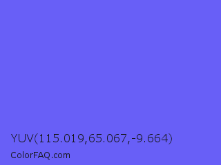 YUV 115.019,65.067,-9.664 Color is a light indigo color and the nearest color is Very Light Blue #6666ff. Hex code #685ff7 and RGB value is rgb(104,95,247). In RGB color space, this color is composed of 41% red, 37% green, 97% blue, In CMYK color space, this color is composed of 58% cyan, 62% magenta, 0% yellow , 3% black , In HSL color space, this color has a hue angle of 244° , 90% saturation and 67% lightness.