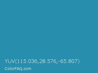 YUV 115.036,28.576,-65.807 Color is a normal blue color and the nearest color is Eastern Blue #1e9ab0. Hex code #288ead and RGB value is rgb(40,142,173). In RGB color space, this color is composed of 16% red, 56% green, 68% blue, In CMYK color space, this color is composed of 77% cyan, 18% magenta, 0% yellow , 32% black , In HSL color space, this color has a hue angle of 194° , 62% saturation and 42% lightness.