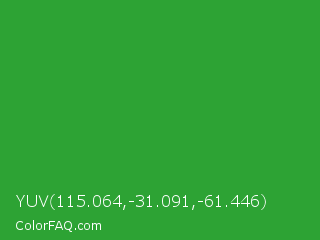 YUV 115.064,-31.091,-61.446 Color is a normal green color and the nearest color is Wageningen Green #34b233. Hex code #2da334 and RGB value is rgb(45,163,52). In RGB color space, this color is composed of 18% red, 64% green, 20% blue, In CMYK color space, this color is composed of 72% cyan, 0% magenta, 68% yellow , 36% black , In HSL color space, this color has a hue angle of 124° , 57% saturation and 41% lightness.