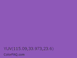 YUV 115.09,33.973,23.6 Color is a normal purple color and the nearest color is Deep Lilac #9955bb. Hex code #8e58b8 and RGB value is rgb(142,88,184). In RGB color space, this color is composed of 56% red, 35% green, 72% blue, In CMYK color space, this color is composed of 23% cyan, 52% magenta, 0% yellow , 28% black , In HSL color space, this color has a hue angle of 274° , 40% saturation and 53% lightness.