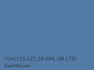YUV 115.127,24.094,-28.175 Color is a normal blue color and the nearest color is Blue Yonder #5072a7. Hex code #537aa4 and RGB value is rgb(83,122,164). In RGB color space, this color is composed of 33% red, 48% green, 64% blue, In CMYK color space, this color is composed of 49% cyan, 26% magenta, 0% yellow , 36% black , In HSL color space, this color has a hue angle of 211° , 33% saturation and 48% lightness.