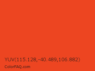 YUV 115.128,-40.489,106.882 Color is a normal red color and the nearest color is Pomegranate #f34723. Hex code #ed4521 and RGB value is rgb(237,69,33). In RGB color space, this color is composed of 93% red, 27% green, 13% blue, In CMYK color space, this color is composed of 0% cyan, 71% magenta, 86% yellow , 7% black , In HSL color space, this color has a hue angle of 11° , 85% saturation and 53% lightness.