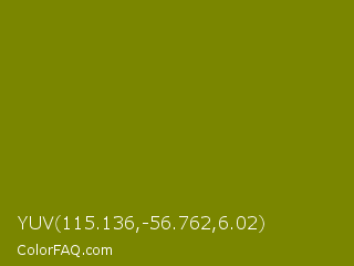 YUV 115.136,-56.762,6.02 Color is a dark yellow color and the nearest color is Olive #808000. Hex code #7a8600 and RGB value is rgb(122,134,-0). In RGB color space, this color is composed of 48% red, 53% green, 0% blue, In CMYK color space, this color is composed of 9% cyan, 0% magenta, 100% yellow , 47% black , In HSL color space, this color has a hue angle of 65° , 100% saturation and 26% lightness.