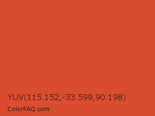 YUV 115.152,-33.599,90.198 Color is a normal red color and the nearest color is Punch #dc4333. Hex code #da4c2f and RGB value is rgb(218,76,47). In RGB color space, this color is composed of 85% red, 30% green, 18% blue, In CMYK color space, this color is composed of 0% cyan, 65% magenta, 78% yellow , 15% black , In HSL color space, this color has a hue angle of 10° , 70% saturation and 52% lightness.