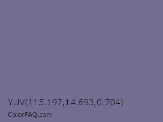 YUV 115.197,14.693,0.704 Color is a normal indigo color and the nearest color is Rum #796989. Hex code #746d91 and RGB value is rgb(116,109,145). In RGB color space, this color is composed of 45% red, 43% green, 57% blue, In CMYK color space, this color is composed of 20% cyan, 25% magenta, 0% yellow , 43% black , In HSL color space, this color has a hue angle of 252° , 14% saturation and 50% lightness.