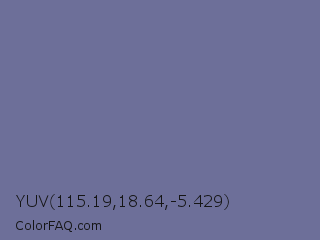 YUV 115.19,18.64,-5.429 Color is a normal blue color and the nearest color is Kimberly #736c9f. Hex code #6d6f99 and RGB value is rgb(109,111,153). In RGB color space, this color is composed of 43% red, 44% green, 60% blue, In CMYK color space, this color is composed of 29% cyan, 27% magenta, 0% yellow , 40% black , In HSL color space, this color has a hue angle of 237° , 18% saturation and 51% lightness.