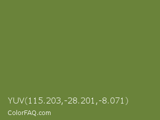 YUV 115.203,-28.201,-8.071 Color is a normal green color and the nearest color is Maximum Green #5e8c31. Hex code #6a833a and RGB value is rgb(106,131,58). In RGB color space, this color is composed of 42% red, 51% green, 23% blue, In CMYK color space, this color is composed of 19% cyan, 0% magenta, 56% yellow , 49% black , In HSL color space, this color has a hue angle of 81° , 39% saturation and 37% lightness.