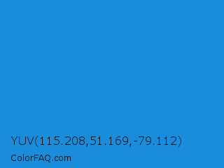 YUV 115.208,51.169,-79.112 Color is a normal blue color and the nearest color is Curious Blue #2596d1. Hex code #198ddb and RGB value is rgb(25,141,219). In RGB color space, this color is composed of 10% red, 55% green, 86% blue, In CMYK color space, this color is composed of 89% cyan, 36% magenta, 0% yellow , 14% black , In HSL color space, this color has a hue angle of 204° , 80% saturation and 48% lightness.