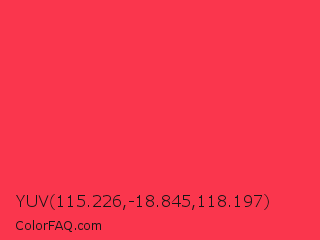 YUV 115.226,-18.845,118.197 Color is a normal red color and the nearest color is Red Salsa #fd3a4a. Hex code #fa364d and RGB value is rgb(250,54,77). In RGB color space, this color is composed of 98% red, 21% green, 30% blue, In CMYK color space, this color is composed of 0% cyan, 78% magenta, 69% yellow , 2% black , In HSL color space, this color has a hue angle of 353° , 95% saturation and 60% lightness.
