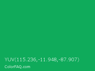 YUV 115.236,-11.948,-87.907 Color is a normal green color and the nearest color is GO Green #00ab66. Hex code #0fab5b and RGB value is rgb(15,171,91). In RGB color space, this color is composed of 6% red, 67% green, 36% blue, In CMYK color space, this color is composed of 91% cyan, 0% magenta, 47% yellow , 33% black , In HSL color space, this color has a hue angle of 149° , 84% saturation and 36% lightness.
