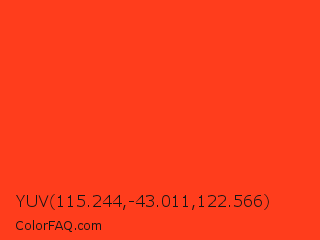 YUV 115.244,-43.011,122.566 Color is a normal red color and the nearest color is Pomegranate #f34723. Hex code #ff3d1c and RGB value is rgb(255,61,28). In RGB color space, this color is composed of 100% red, 24% green, 11% blue, In CMYK color space, this color is composed of 0% cyan, 76% magenta, 89% yellow , 0% black , In HSL color space, this color has a hue angle of 9° , 100% saturation and 55% lightness.