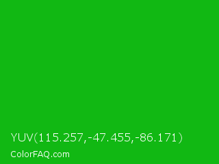 YUV 115.257,-47.455,-86.171 Color is a normal green color and the nearest color is Vivid Malachite #00cc33. Hex code #11b813 and RGB value is rgb(17,184,19). In RGB color space, this color is composed of 7% red, 72% green, 7% blue, In CMYK color space, this color is composed of 91% cyan, 0% magenta, 90% yellow , 28% black , In HSL color space, this color has a hue angle of 121° , 83% saturation and 39% lightness.