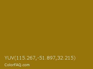 YUV 115.267,-51.897,32.215 Color is a normal orange color and the nearest color is Buttered Rum #a1750d. Hex code #98750a and RGB value is rgb(152,117,10). In RGB color space, this color is composed of 60% red, 46% green, 4% blue, In CMYK color space, this color is composed of 0% cyan, 23% magenta, 93% yellow , 40% black , In HSL color space, this color has a hue angle of 45° , 88% saturation and 32% lightness.