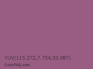 YUV 115.272,7.754,33.087 Color is a normal magenta color and the nearest color is Antique Fuchsia #915c83. Hex code #995d83 and RGB value is rgb(153,93,131). In RGB color space, this color is composed of 60% red, 36% green, 51% blue, In CMYK color space, this color is composed of 0% cyan, 39% magenta, 14% yellow , 40% black , In HSL color space, this color has a hue angle of 322° , 24% saturation and 48% lightness.