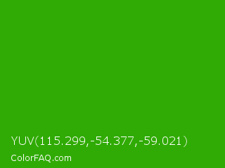 YUV 115.299,-54.377,-59.021 Color is a normal green color and the nearest color is Slimy Green #299617. Hex code #30ab05 and RGB value is rgb(48,171,5). In RGB color space, this color is composed of 19% red, 67% green, 2% blue, In CMYK color space, this color is composed of 72% cyan, 0% magenta, 97% yellow , 33% black , In HSL color space, this color has a hue angle of 104° , 94% saturation and 35% lightness.