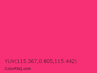 YUV 115.367,0.805,115.442 Color is a normal rose color and the nearest color is Cerise Pink #ec3b83. Hex code #f73075 and RGB value is rgb(247,48,117). In RGB color space, this color is composed of 97% red, 19% green, 46% blue, In CMYK color space, this color is composed of 0% cyan, 81% magenta, 53% yellow , 3% black , In HSL color space, this color has a hue angle of 339° , 93% saturation and 58% lightness.