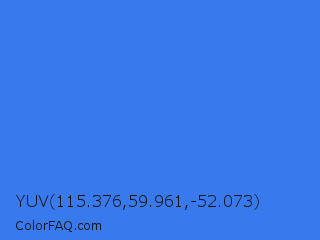 YUV 115.376,59.961,-52.073 Color is a normal blue color and the nearest color is Bleu De France #318ce7. Hex code #387aed and RGB value is rgb(56,122,237). In RGB color space, this color is composed of 22% red, 48% green, 93% blue, In CMYK color space, this color is composed of 76% cyan, 49% magenta, 0% yellow , 7% black , In HSL color space, this color has a hue angle of 218° , 83% saturation and 57% lightness.