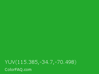 YUV 115.385,-34.7,-70.498 Color is a normal green color and the nearest color is Wageningen Green #34b233. Hex code #23aa2d and RGB value is rgb(35,170,45). In RGB color space, this color is composed of 14% red, 67% green, 18% blue, In CMYK color space, this color is composed of 79% cyan, 0% magenta, 74% yellow , 33% black , In HSL color space, this color has a hue angle of 124° , 66% saturation and 40% lightness.