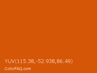 YUV 115.38,-52.938,86.49 Color is a normal orange color and the nearest color is Red Stage #d05f04. Hex code #d65608 and RGB value is rgb(214,86,8). In RGB color space, this color is composed of 84% red, 34% green, 3% blue, In CMYK color space, this color is composed of 0% cyan, 60% magenta, 96% yellow , 16% black , In HSL color space, this color has a hue angle of 23° , 93% saturation and 44% lightness.