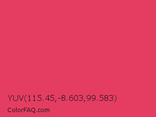 YUV 115.45,-8.603,99.583 Color is a normal red color and the nearest color is Paradise Pink #e63e62. Hex code #e53d62 and RGB value is rgb(229,61,98). In RGB color space, this color is composed of 90% red, 24% green, 38% blue, In CMYK color space, this color is composed of 0% cyan, 73% magenta, 57% yellow , 10% black , In HSL color space, this color has a hue angle of 347° , 76% saturation and 57% lightness.