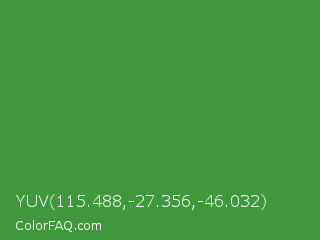 YUV 115.488,-27.356,-46.032 Color is a normal green color and the nearest color is May Green #4c9141. Hex code #3f993c and RGB value is rgb(63,153,60). In RGB color space, this color is composed of 25% red, 60% green, 24% blue, In CMYK color space, this color is composed of 59% cyan, 0% magenta, 61% yellow , 40% black , In HSL color space, this color has a hue angle of 118° , 44% saturation and 42% lightness.