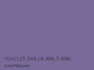 YUV 115.544,18.466,3.908 Color is a normal indigo color and the nearest color is Kimberly #736c9f. Hex code #786a99 and RGB value is rgb(120,106,153). In RGB color space, this color is composed of 47% red, 42% green, 60% blue, In CMYK color space, this color is composed of 22% cyan, 31% magenta, 0% yellow , 40% black , In HSL color space, this color has a hue angle of 258° , 19% saturation and 51% lightness.