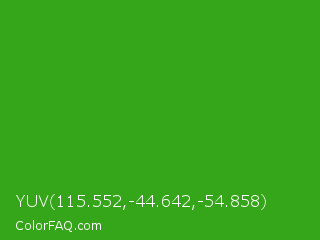 YUV 115.552,-44.642,-54.858 Color is a normal green color and the nearest color is Slimy Green #299617. Hex code #35a519 and RGB value is rgb(53,165,25). In RGB color space, this color is composed of 21% red, 65% green, 10% blue, In CMYK color space, this color is composed of 68% cyan, 0% magenta, 85% yellow , 35% black , In HSL color space, this color has a hue angle of 108° , 74% saturation and 37% lightness.