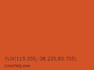 YUV 115.555,-38.235,83.705 Color is a normal color and the nearest color is Flame #e25822. Hex code #d35226 and RGB value is rgb(211,82,38). In RGB color space, this color is composed of 83% red, 32% green, 15% blue, In CMYK color space, this color is composed of 0% cyan, 61% magenta, 82% yellow , 17% black , In HSL color space, this color has a hue angle of 15° , 69% saturation and 49% lightness.
