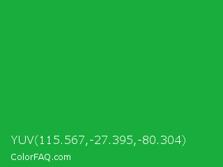 YUV 115.567,-27.395,-80.304 Color is a normal green color and the nearest color is Green Pantone #00ad43. Hex code #18ad3c and RGB value is rgb(24,173,60). In RGB color space, this color is composed of 9% red, 68% green, 24% blue, In CMYK color space, this color is composed of 86% cyan, 0% magenta, 65% yellow , 32% black , In HSL color space, this color has a hue angle of 134° , 76% saturation and 39% lightness.