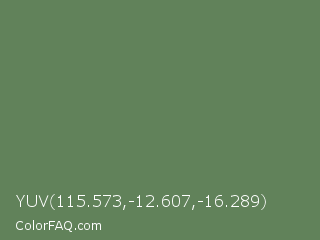 YUV 115.573,-12.607,-16.289 Color is a normal green color and the nearest color is Glade Green #61845f. Hex code #61825a and RGB value is rgb(97,130,90). In RGB color space, this color is composed of 38% red, 51% green, 35% blue, In CMYK color space, this color is composed of 25% cyan, 0% magenta, 31% yellow , 49% black , In HSL color space, this color has a hue angle of 110° , 18% saturation and 43% lightness.