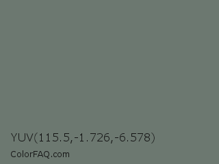 YUV 115.5,-1.726,-6.578 Color is a normal green color and the nearest color is Nickel #727472. Hex code #6c7870 and RGB value is rgb(108,120,112). In RGB color space, this color is composed of 42% red, 47% green, 44% blue, In CMYK color space, this color is composed of 10% cyan, 0% magenta, 7% yellow , 53% black , In HSL color space, this color has a hue angle of 140° , 5% saturation and 45% lightness.