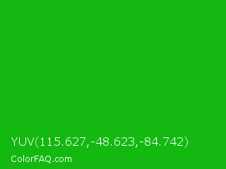 YUV 115.627,-48.623,-84.742 Color is a normal green color and the nearest color is Slimy Green #299617. Hex code #13b811 and RGB value is rgb(19,184,17). In RGB color space, this color is composed of 7% red, 72% green, 7% blue, In CMYK color space, this color is composed of 90% cyan, 0% magenta, 91% yellow , 28% black , In HSL color space, this color has a hue angle of 119° , 83% saturation and 39% lightness.