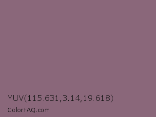 YUV 115.631,3.14,19.618 Color is a normal magenta color and the nearest color is Opium #8e6f70. Hex code #8a677a and RGB value is rgb(138,103,122). In RGB color space, this color is composed of 54% red, 40% green, 48% blue, In CMYK color space, this color is composed of 0% cyan, 25% magenta, 12% yellow , 46% black , In HSL color space, this color has a hue angle of 327° , 15% saturation and 47% lightness.