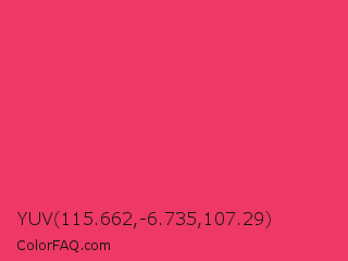 YUV 115.662,-6.735,107.29 Color is a normal red color and the nearest color is Paradise Pink #e63e62. Hex code #ee3866 and RGB value is rgb(238,56,102). In RGB color space, this color is composed of 93% red, 22% green, 40% blue, In CMYK color space, this color is composed of 0% cyan, 76% magenta, 57% yellow , 7% black , In HSL color space, this color has a hue angle of 345° , 84% saturation and 58% lightness.