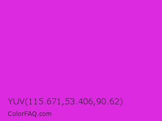 YUV 115.671,53.406,90.62 Color is a normal magenta color and the nearest color is Steel Pink #cc33cc. Hex code #db2ae0 and RGB value is rgb(219,42,224). In RGB color space, this color is composed of 86% red, 16% green, 88% blue, In CMYK color space, this color is composed of 2% cyan, 81% magenta, 0% yellow , 12% black , In HSL color space, this color has a hue angle of 298° , 75% saturation and 52% lightness.