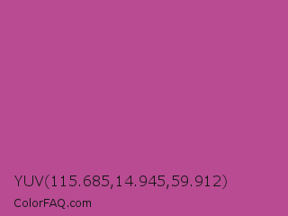 YUV 115.685,14.945,59.912 Color is a normal magenta color and the nearest color is Mulberry #c54b8c. Hex code #b84b92 and RGB value is rgb(184,75,146). In RGB color space, this color is composed of 72% red, 29% green, 57% blue, In CMYK color space, this color is composed of 0% cyan, 59% magenta, 21% yellow , 28% black , In HSL color space, this color has a hue angle of 321° , 43% saturation and 51% lightness.